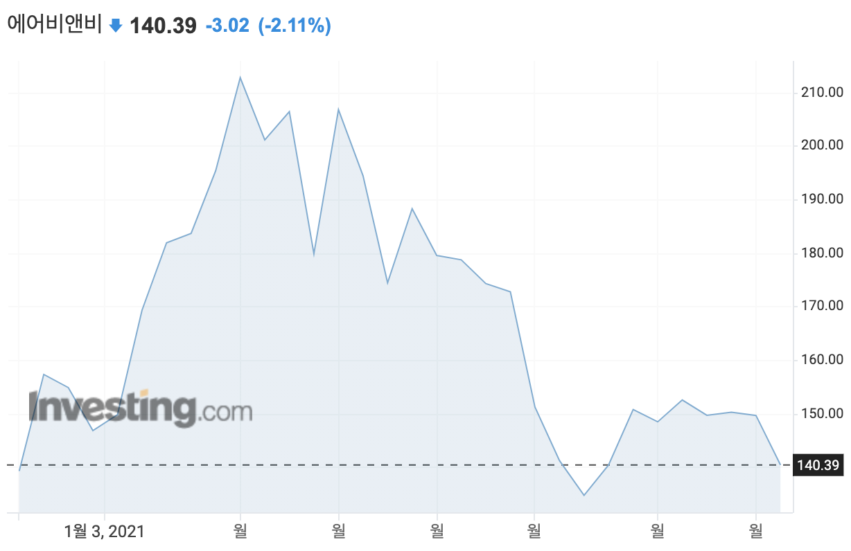 에어비앤비의 현재 주가는 140달러 선으로
