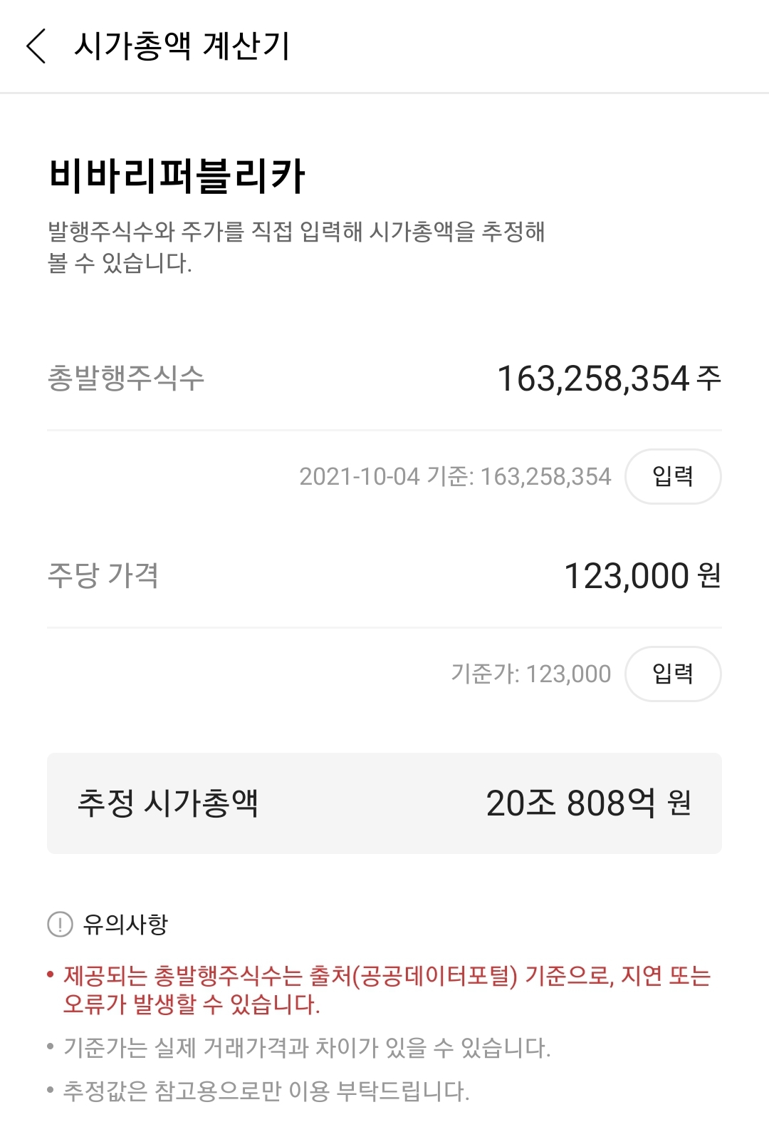 거래기준가와 발행주식수를 곱해 현재 장외시장에서 비바리퍼블리카에 매겨진 추정 시가총액을 계산할 수 있습니다.
