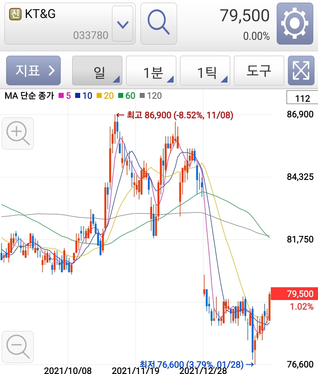 KT&G의 주가는 79,950원으로