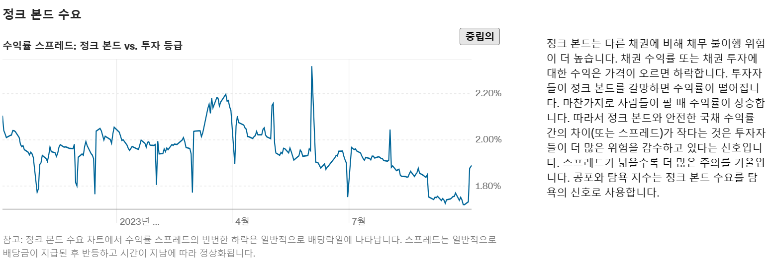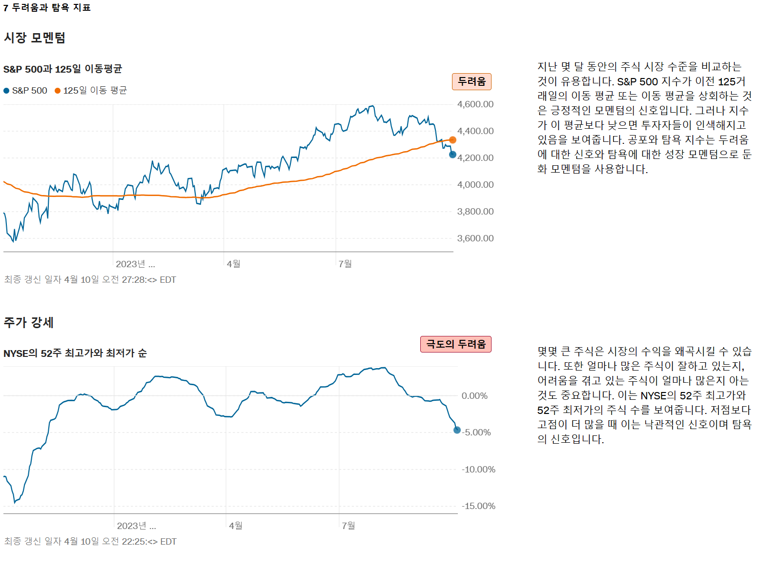 공포와 탐욕 지수는 주식 시장 행동의 일부 측면을 측정하는 0 가지 지표의 모음입니다. 시장 모멘텀, 주가 강도, 주가 폭, 풋 및 콜 옵션, 정크 본드 수요, 시장 변동성 및 안전 피난처 수요입니다. 이 지수는 이러한 개별 지표가 일반적으로 얼마나 차이가 나는지와 비교하여 평균에서 얼마나 벗어났는지 추적합니다. 이 지수는 100에서 100까지의 점수를 계산할 때 각 지표에 동일한 가중치를 부여하며, 0은 최대 탐욕을 나타내고 <>은 최대 두려움을 나타냅니다.