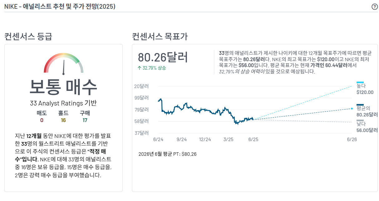 인베스팅 닷컴 애널리스트 대상 나이키 예상 주가